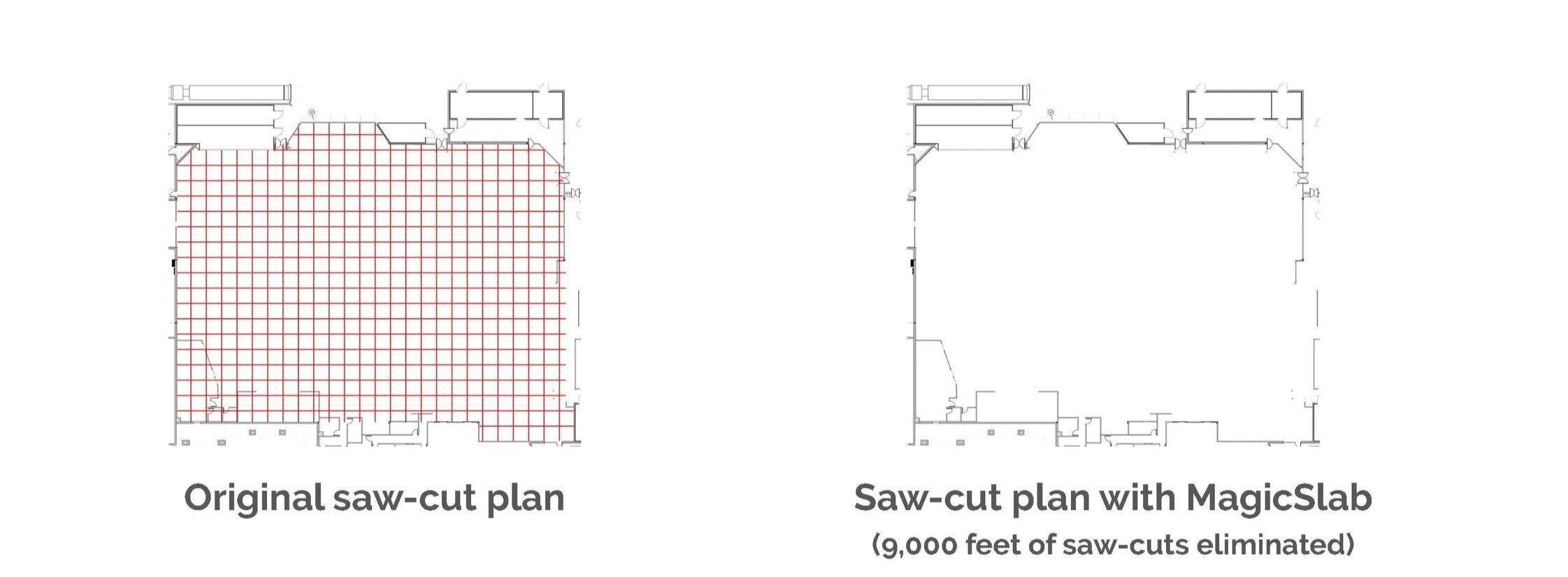 Extensive research was conducted on existing solutions to prevent or control cracking, with nearly 100,000 SF of test slabs poured. Each test revealed small things we needed to change. Finally a process was developed that eliminated more than 95% of typical cracks and saw-cut joints and most of the cold joints. This patented process is called MagicSlab™ and it produces slabs that are seamless, crack-free, durable and easy to maintain.